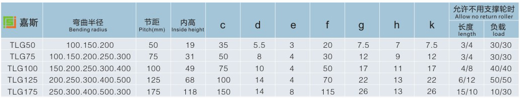JS.106006 TLG型鋼制拖鏈 TLG型鋼制拖鏈可承載數(shù)量多,重量大的電纜及油管,自由懸置(允許不用支承輪)長(zhǎng)度大,支撐板可依顧客需要制作,適用于工作母機(jī),移動(dòng)機(jī)械等。其彎曲半徑為50-600mm,鏈板高度為35-150mm,可任意使用。 TLG型鋼制拖鏈其使用行程較大為32米。適用于所有傳動(dòng)方式?呻S意加長(zhǎng)和縮短。此外,可通過(guò)改變銷軸獲得改變彎曲半徑。 拖鏈的支撐板寬度為150mm至600mm,孔與孔之間的間隔量為5mm。 鏈板的高度,也就是支撐板的高度,是由電纜較大直徑?jīng)Q定的,機(jī)床較大限度運(yùn)轉(zhuǎn)時(shí),如拖鏈的寬度超過(guò)300mm,拖鏈的長(zhǎng)度超過(guò)4m時(shí)出于穩(wěn)定性原因,應(yīng)考慮選擇加大一號(hào)規(guī)格的拖鏈。 彎曲半徑要根據(jù)電纜的較大直徑選擇并應(yīng)達(dá)到電纜直徑的10倍。彎曲半徑可根據(jù)所給表格選擇50-600mm,行程小的可相應(yīng)選擇較小的半徑。 拖鏈的長(zhǎng)=1/2行程+4個(gè)彎曲半徑,這只適用于當(dāng)固定聯(lián)結(jié)是在行程的中點(diǎn)時(shí)。 拖鏈的固定可根據(jù)機(jī)床的位置情況選擇。固定角鋼可放在外圍或內(nèi)周的拖鏈內(nèi)或外部,一般情況聯(lián)結(jié)部分在拖鏈內(nèi),而向外周。